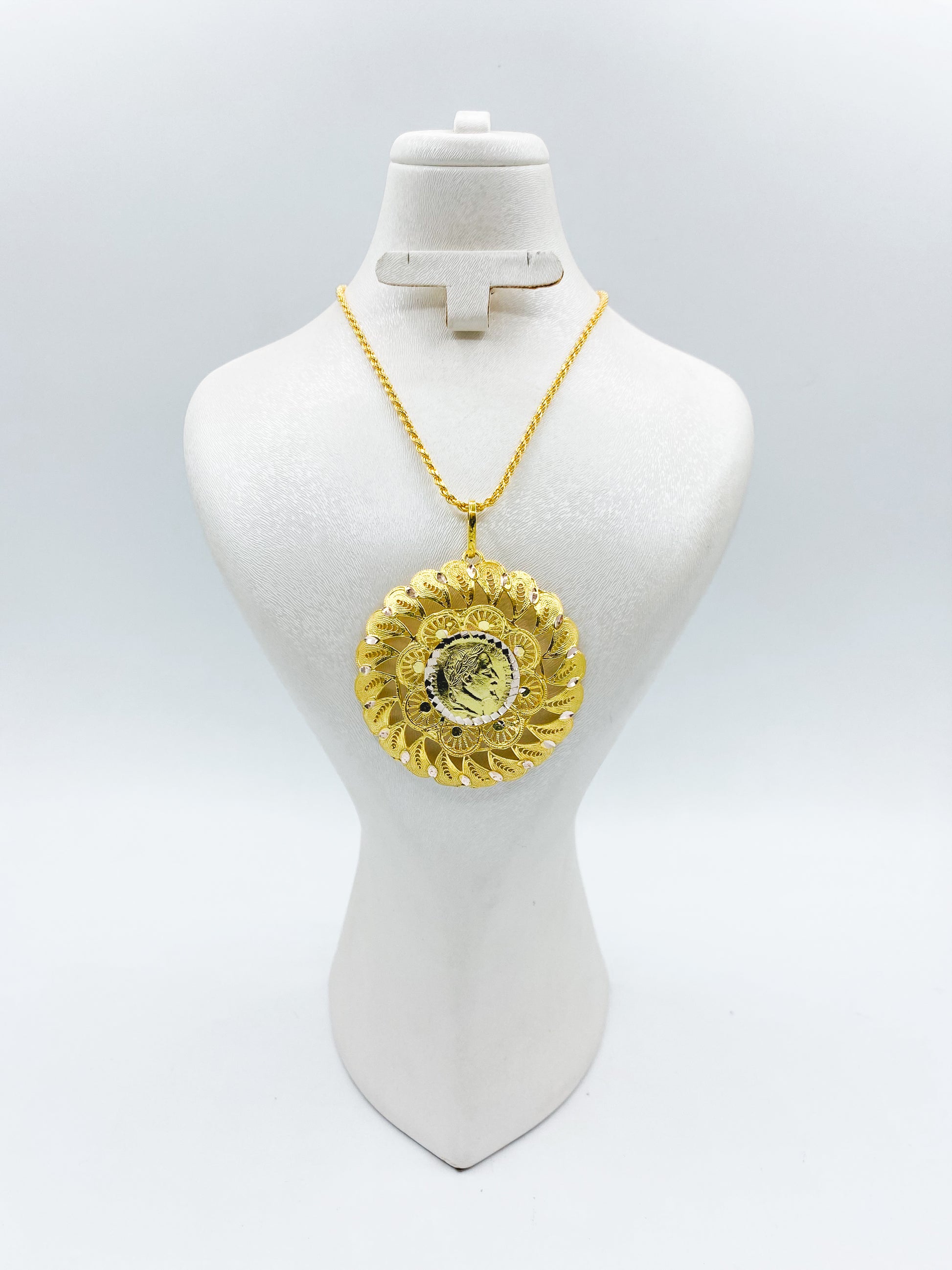 استمتع بأناقة لا تضاهى مع قلادة اللويز الفاخرة، المصنوعة من الفضة الخالصة والمشللة بالذهب. تتميز بتصميمها الملكي الفريد الذي يجمع بين ارث الأجداد و الأناقة العصرية. مصنوعة بعناية ودقة لتبرز جمال التفاصيل