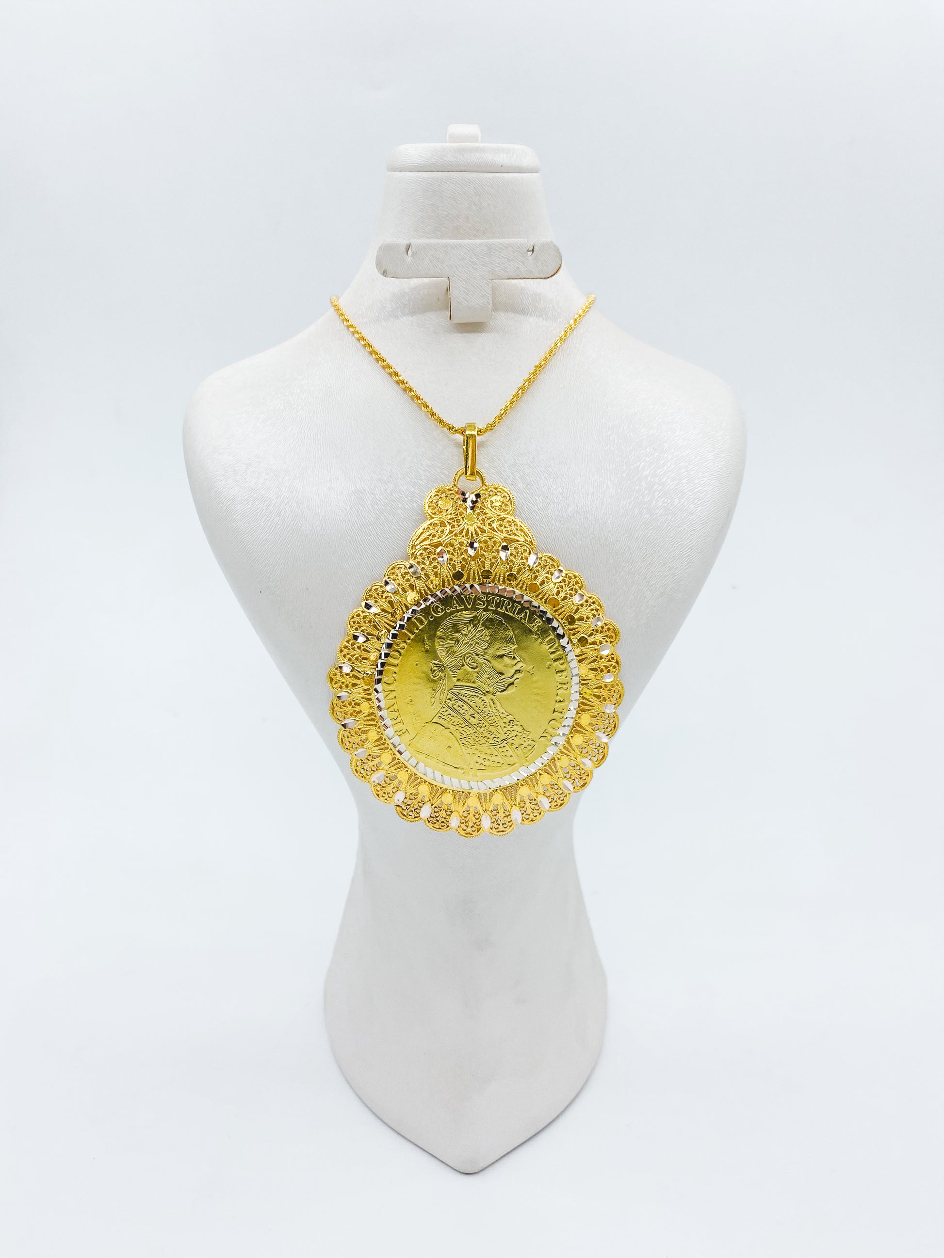 استمتع بأناقة لا تضاهى مع قلادة اللويز الفاخرة، المصنوعة من الفضة الخالصة والمشللة بالذهب. تتميز بتصميمها الملكي الفريد الذي يجمع بين ارث الأجداد و الأناقة العصرية. مصنوعة بعناية ودقة لتبرز جمال التفاصيل